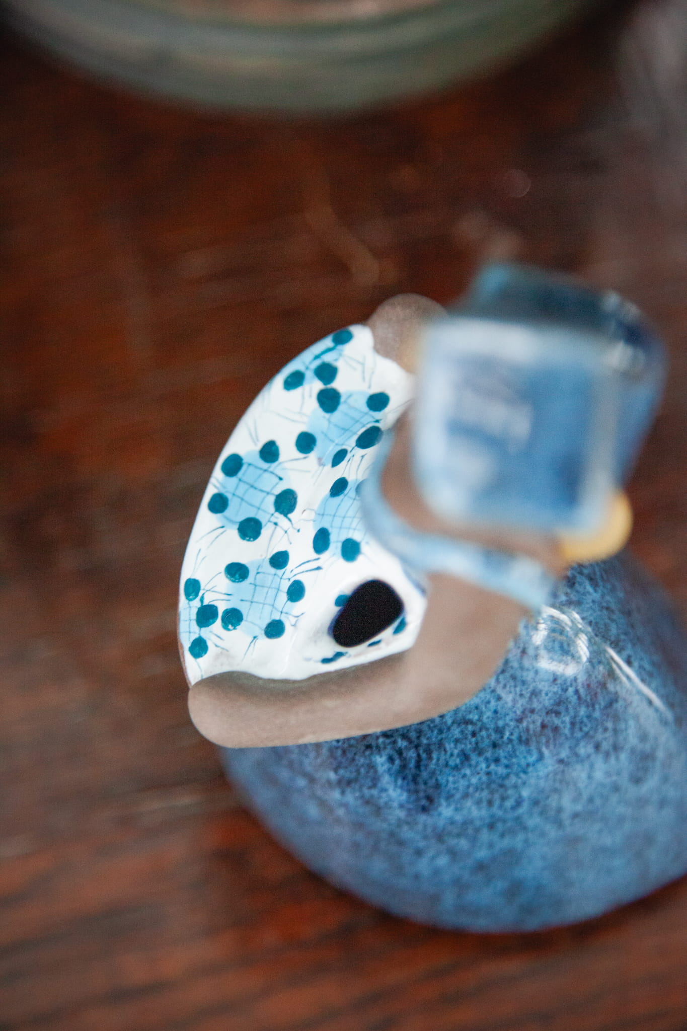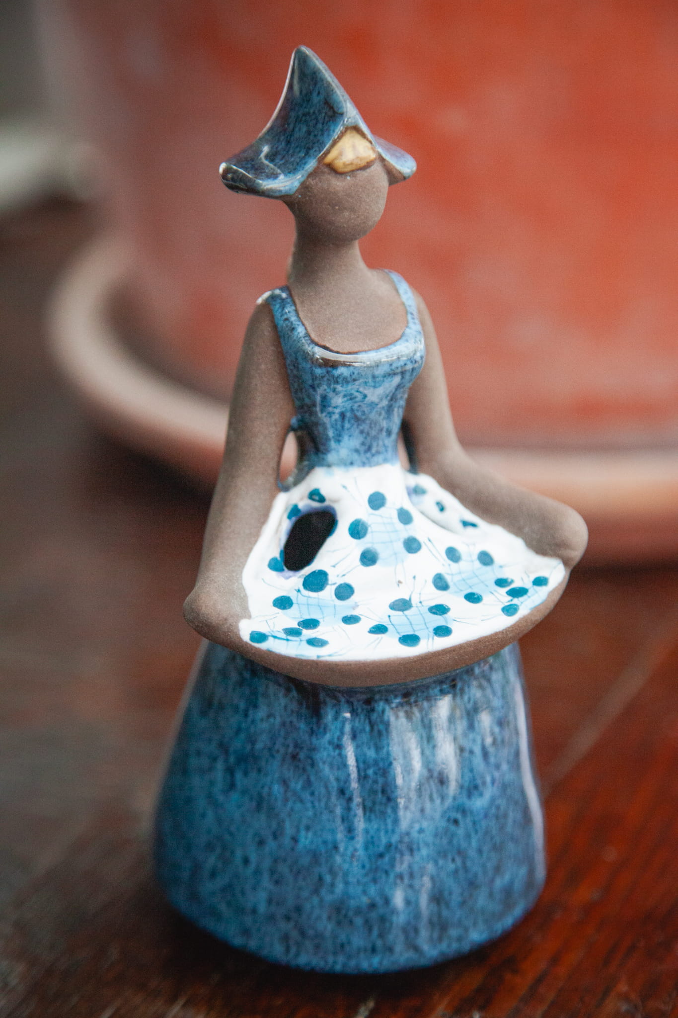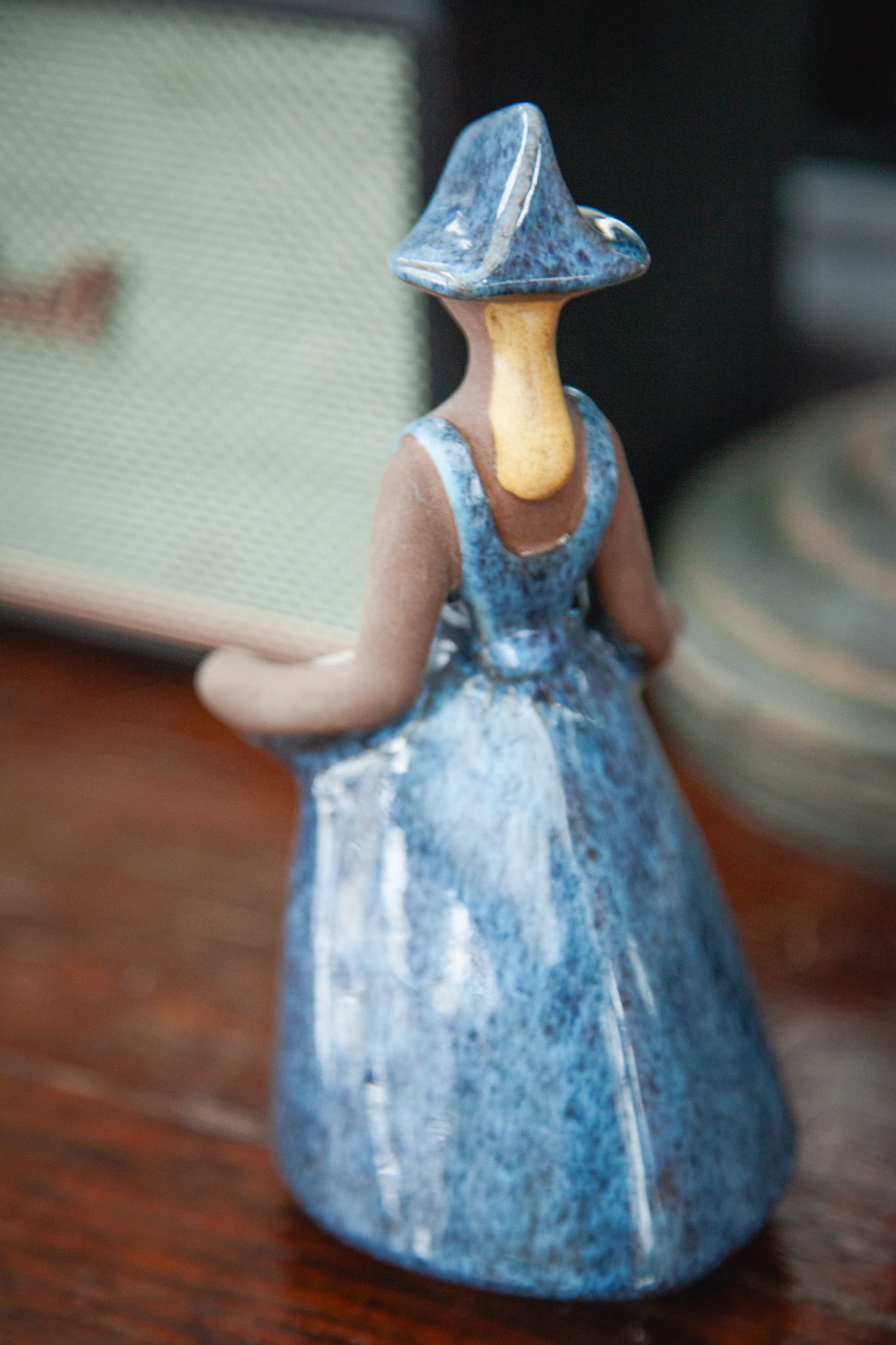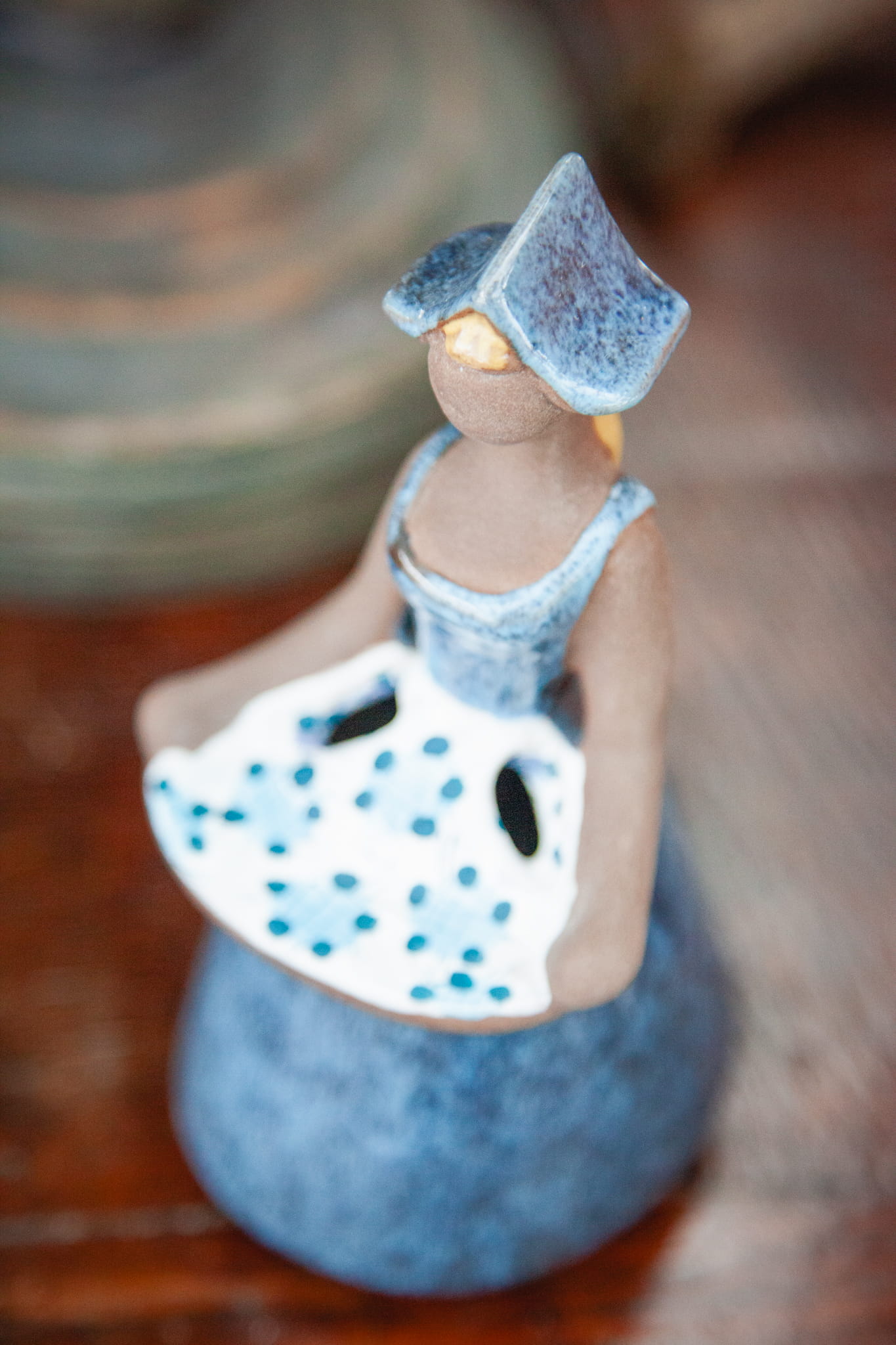 Figurka utrzymana w przepięknych odcieniach niebieskiego przedstawia dziewczynę trzymającą tacę z kwiatami w sukni oraz w czepku. Dłonie i twarz nieszkliwione. W okolicy dłoni otwór przeznaczony na suszone kwiaty.