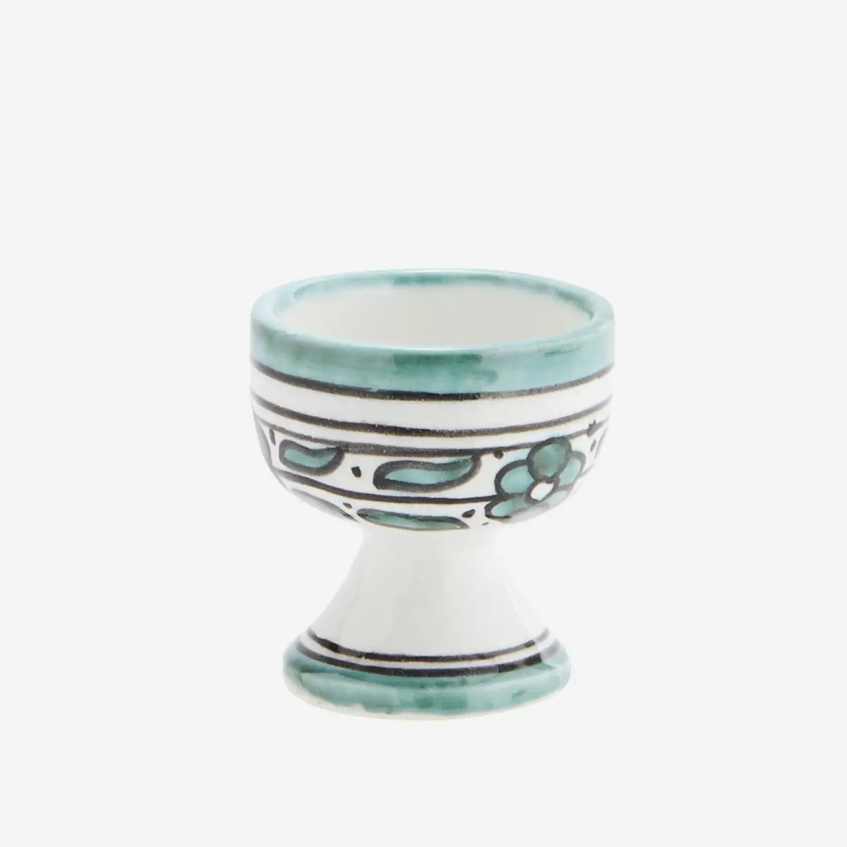 Piękny, ręcznie wykonany kamionkowy kieliszek na jajko z Fezu w północnym Maroku. Każdy egzemplarz jest wypalany i dekorowany ręcznie. Dlatego mogą występować niedoskonałości i różnice. Wszystko co dodaje uroku i podkreśla rękodzielniczy charakter. Kamionkę można myć w zmywarce, ale nie należy jej wkładać do kuchenki mikrofalowej.
