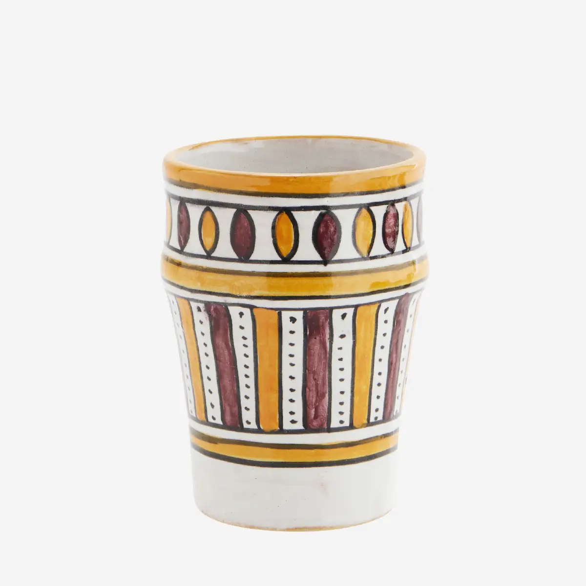 Piękny, ręcznie wykonany kubek kamionkowy z Fezu w północnym Maroku. Każdy egzemplarz jest wypalany i dekorowany ręcznie. Dlatego mogą występować niedoskonałości i różnice. Wszystko to dodaje uroku i podkreśla rękodzielniczy charakter. Kubki marokańskie są używane przez mieszkańców zarówno do napojów, jak i dekoracji. Pij poranną herbatę z filiżanki w jaskrawych kolorach lub pozwól, aby ozdobiła Twoją łazienkę jako kubek na szczoteczkę do zębów. Kamionkę można myć w zmywarce, ale nie należy jej wkładać do kuchenki mikrofalowej.