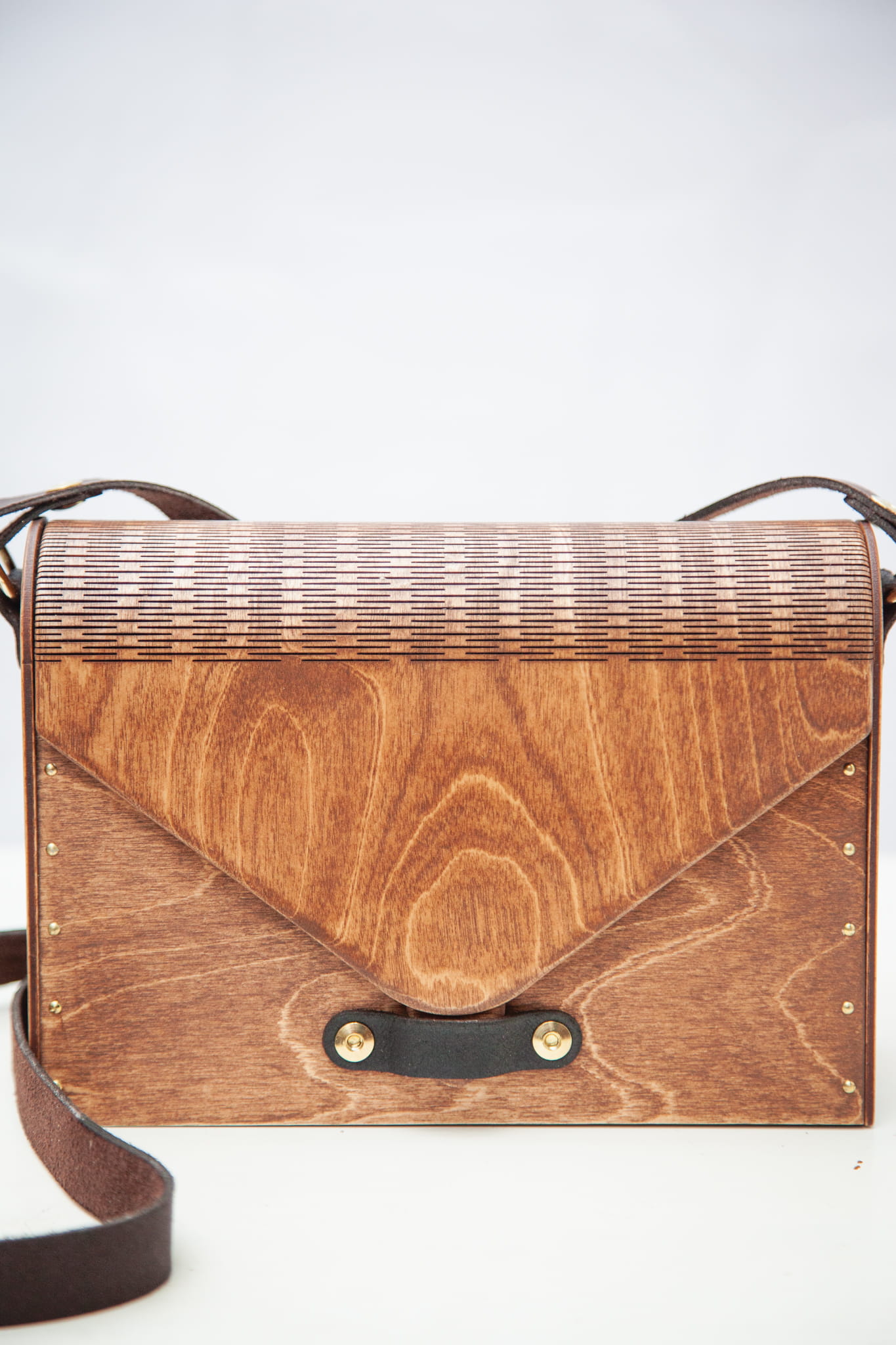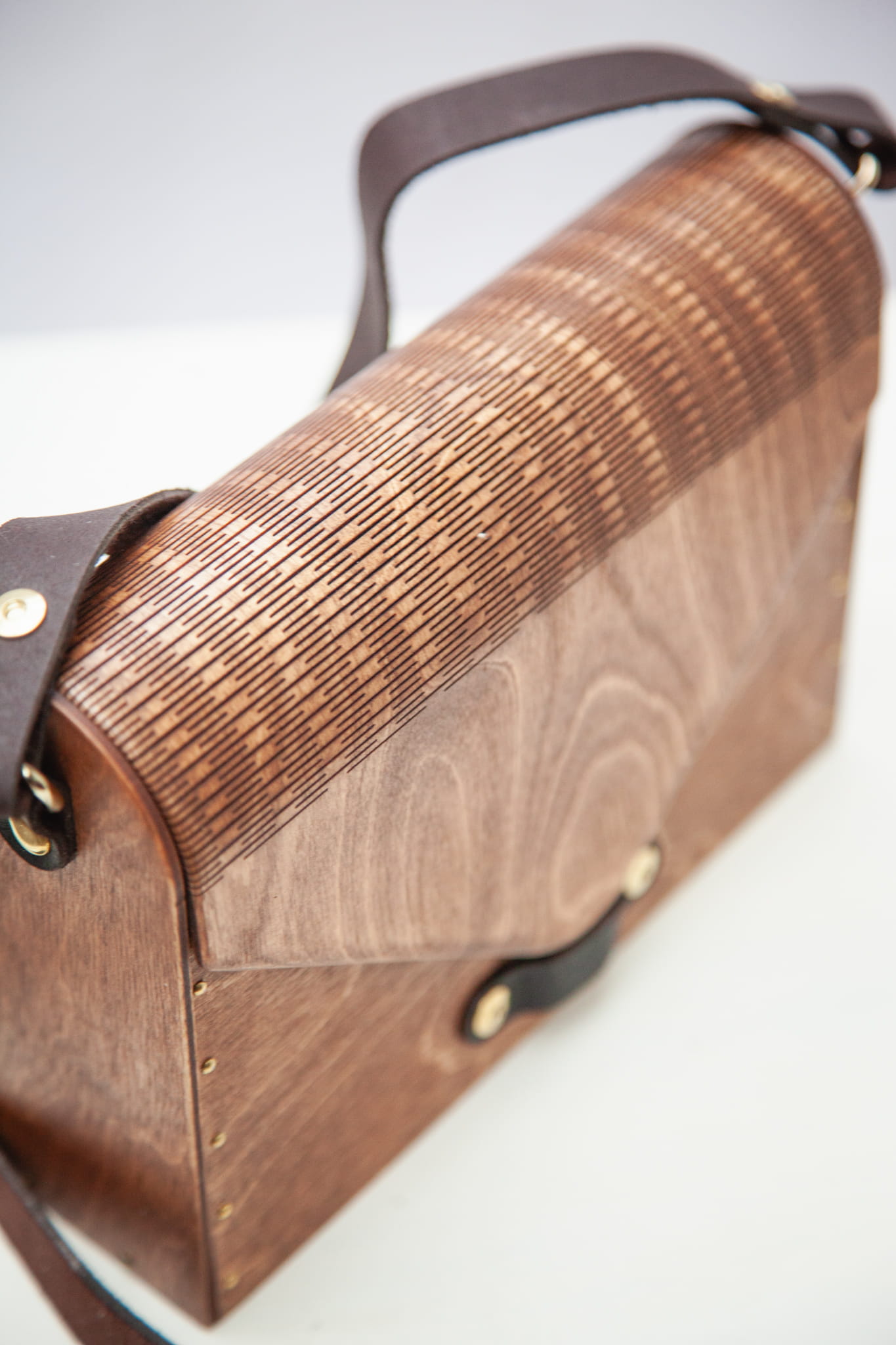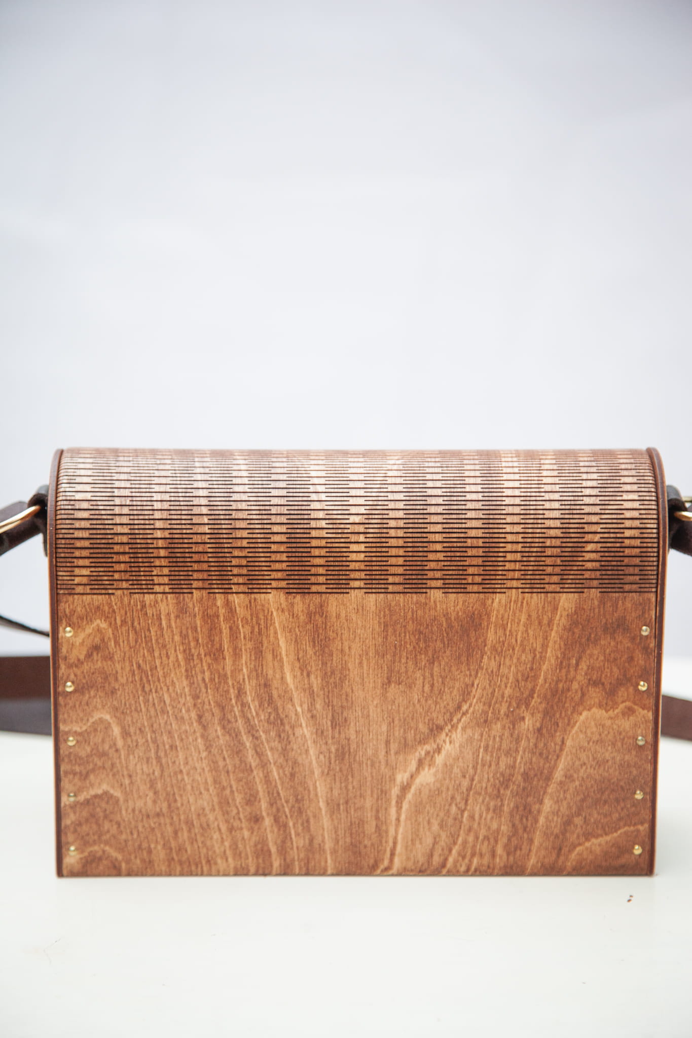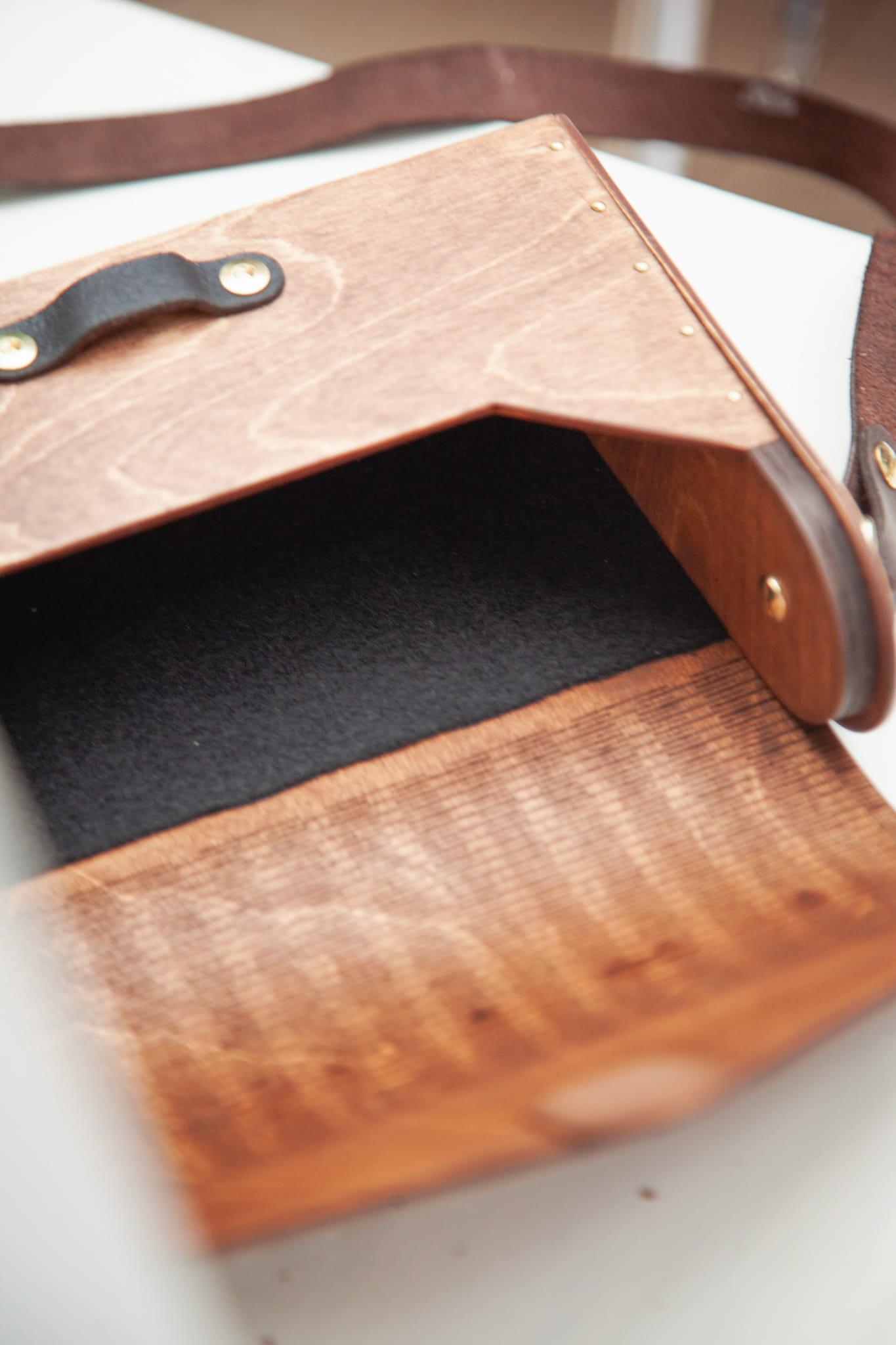 Torebka prostokątna wykonana ze sklejki brzozowej ze wstawkami i paskiem ze skóry naturalnej oraz