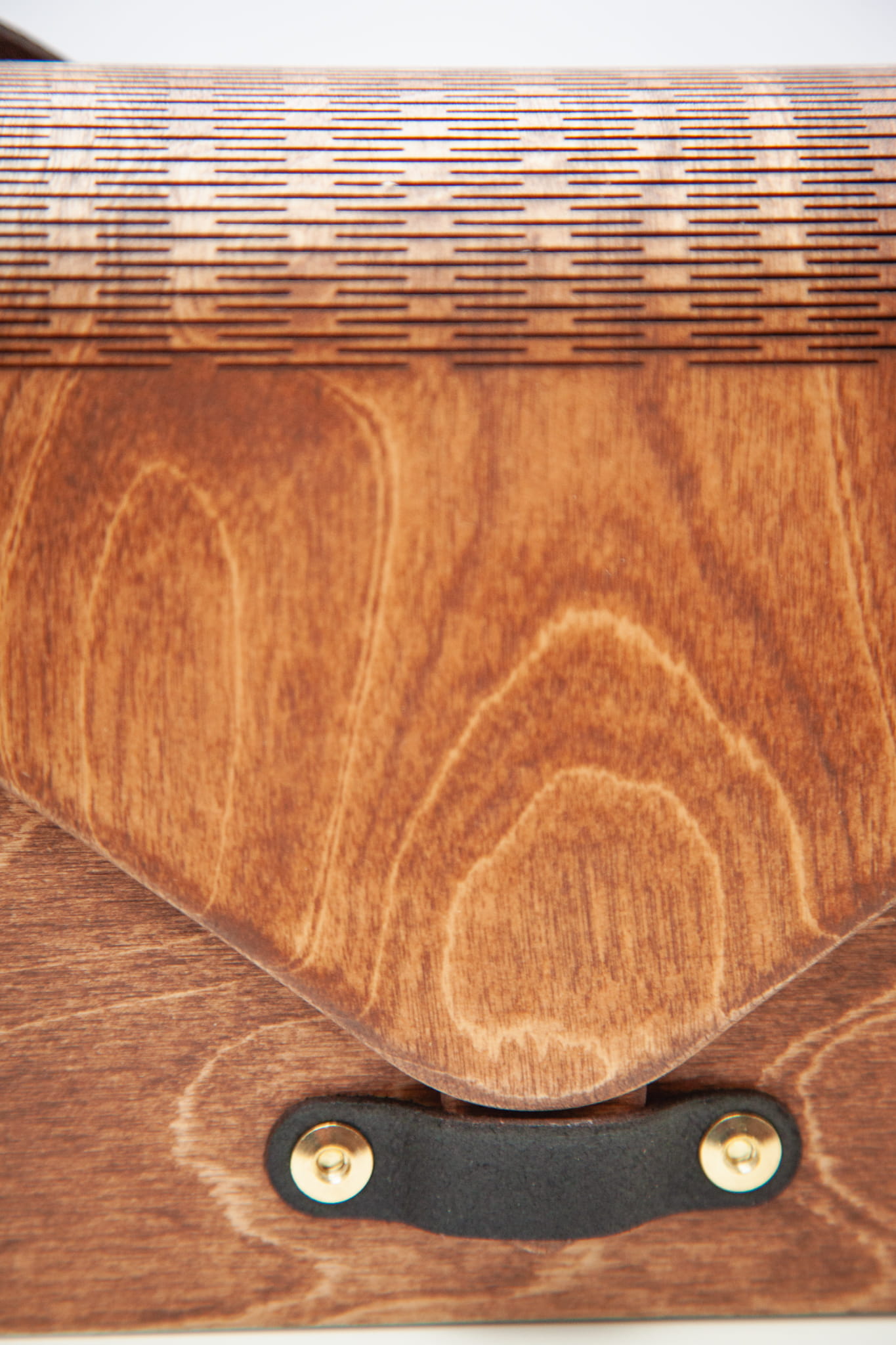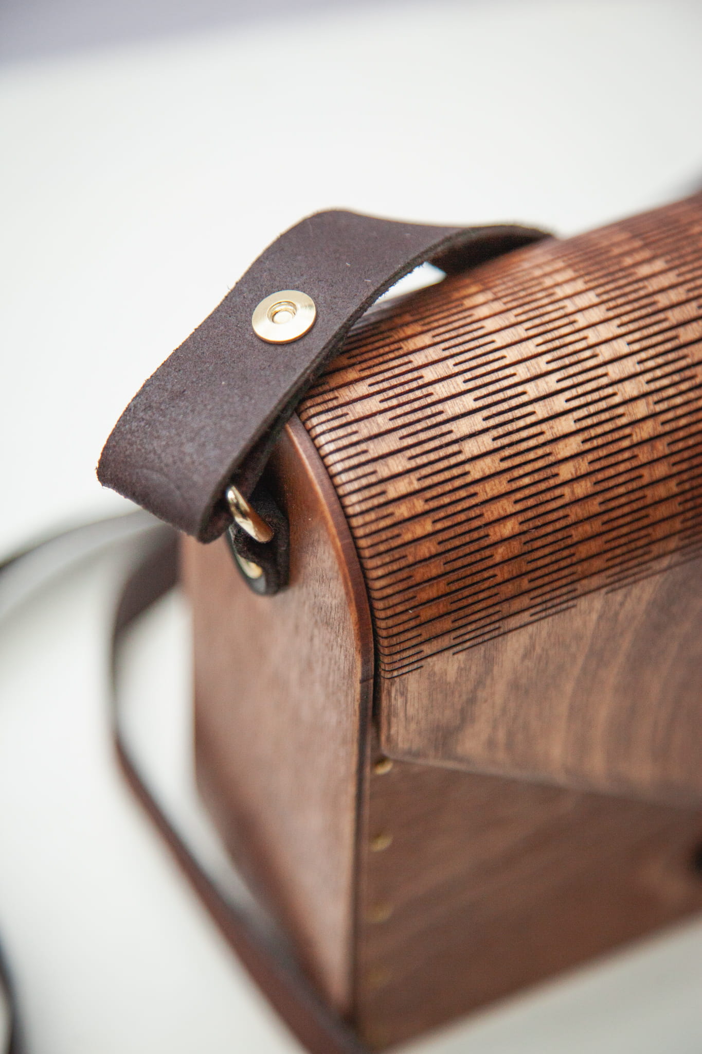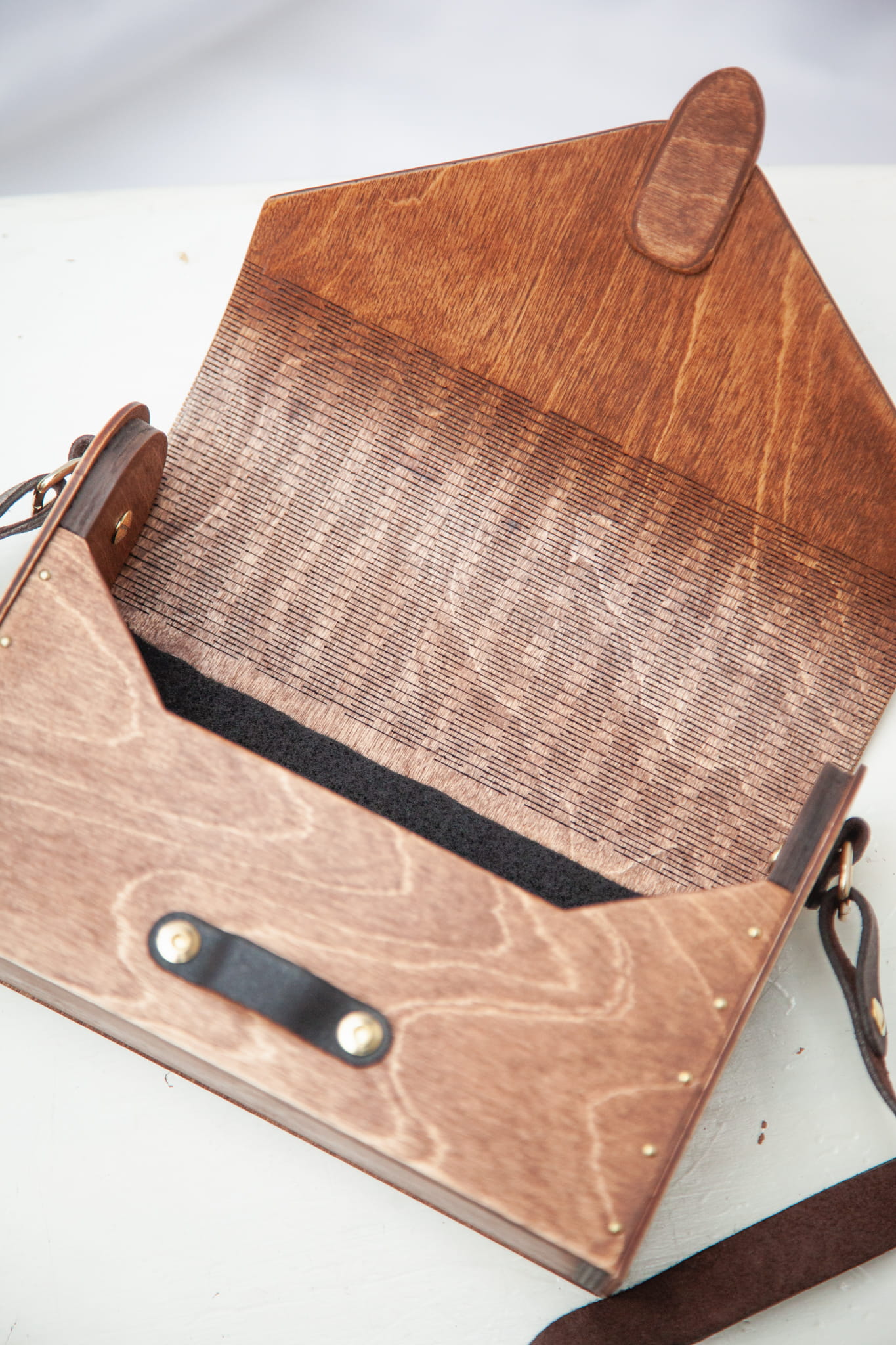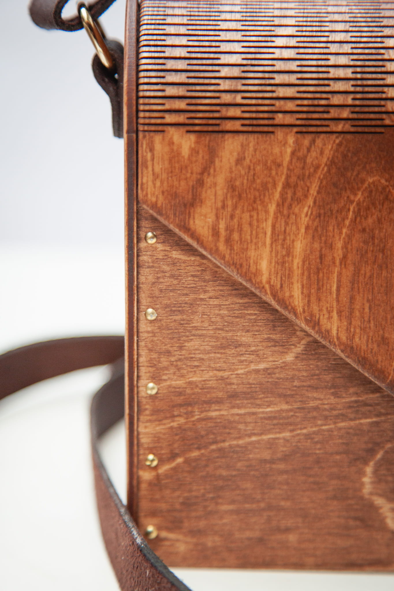 Torebka prostokątna wykonana ze sklejki brzozowej ze wstawkami i paskiem ze skóry naturalnej oraz