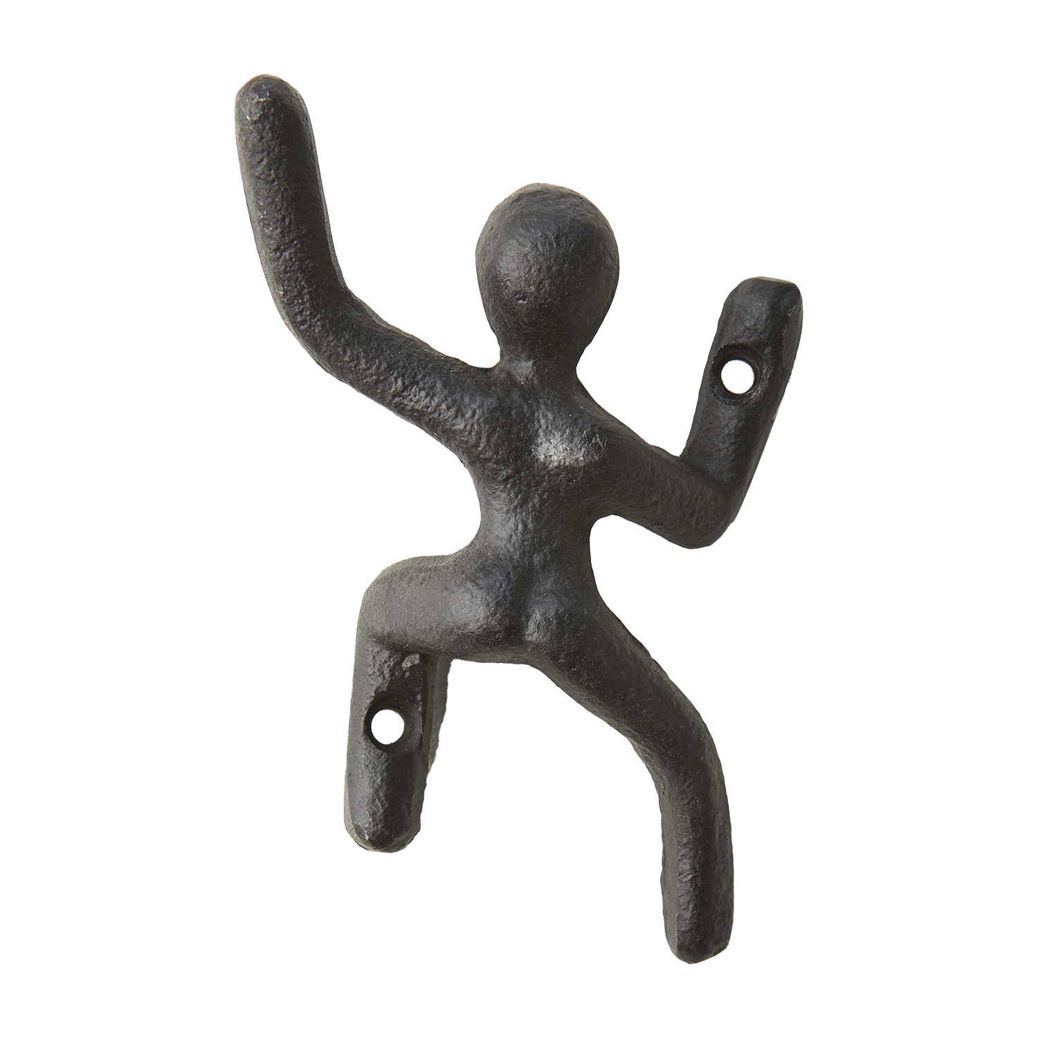 Zabawny żeliwny wieszak na ubrania w kształcie wspinającego się ludzika.